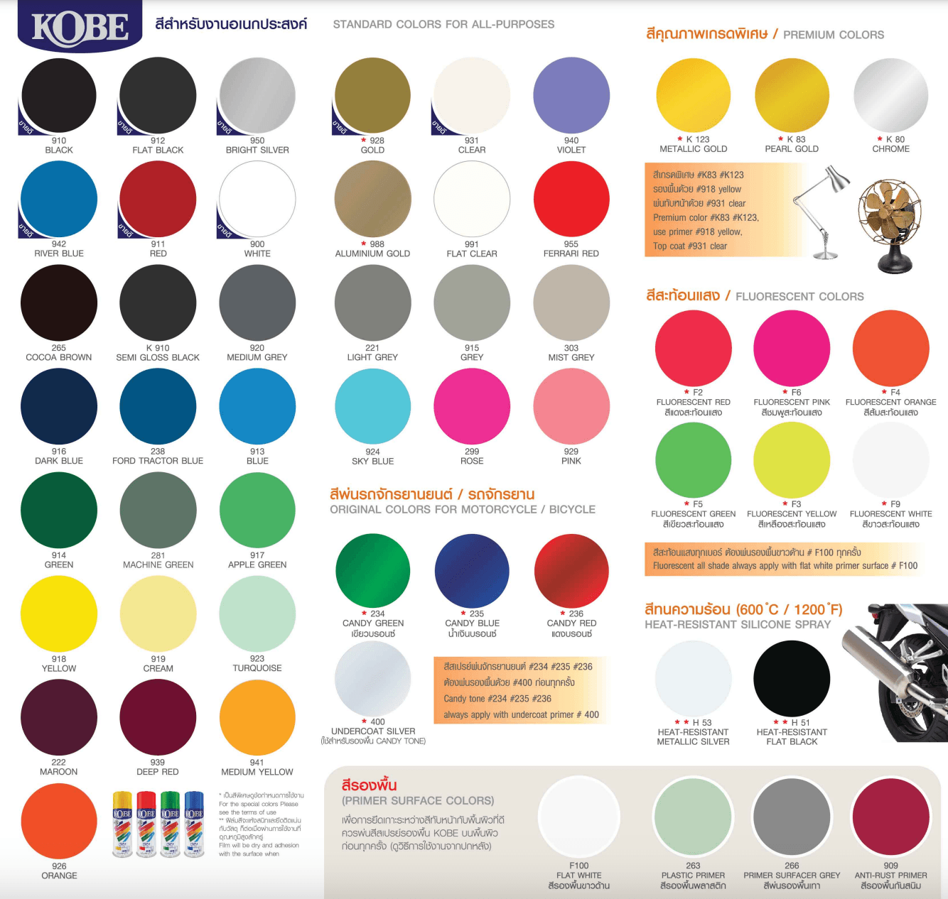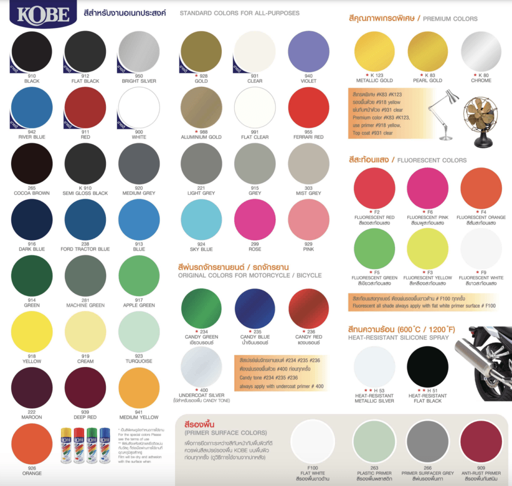 2. ขั้นตอนที่สอง เราต้องเลือกสีสเปรย์โกเบ Spray KOBE รองพื้นให้ถูกต้อง ตรงตามประเภทของพื้นผิว โดยจะแบ่งตามลักษะของผิวตามรหัสของสีดังนี้ เช่น
